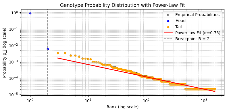 This function uses a hybrid model: 1. The “head” (high-frequency genotypes) uses empirical probabilities. 2. The “tail” (low-frequency and unobserved genotypes) is modeled with a power-law (Zipf) distribution.